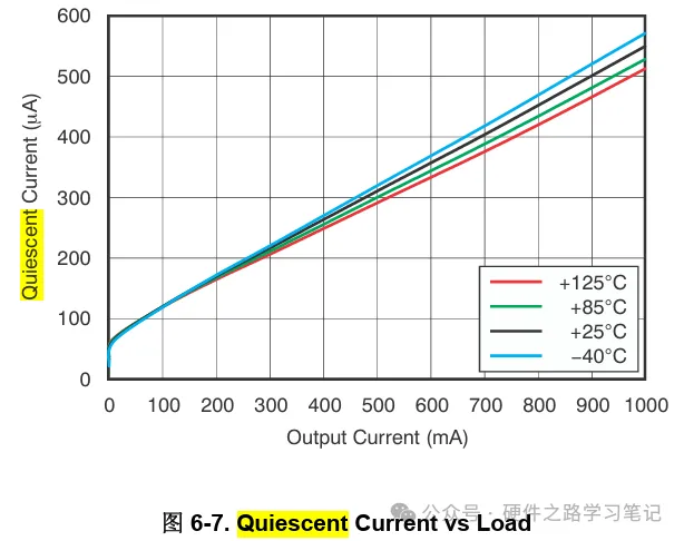 一般的LDO静态电流在uA级别,但是随着负载的增加,器件自身消耗的电流也在增加,如下图的TLV1117LV33DCYR: