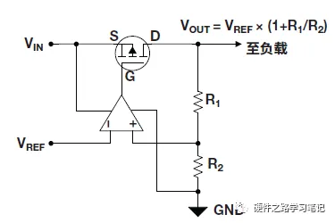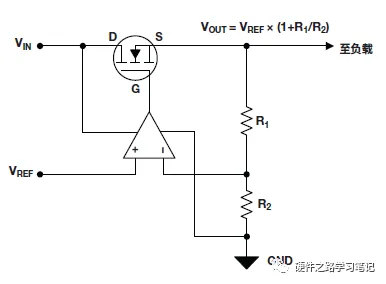 以下图为例,当输出电压Vout增大时,误差放大器正端大于参考电压Vref,误差放大器输出电压增大,此时MOS管G极电压增大,若VIN不变,即S级电压不变,则PMOS的Vgs电压Vg-Vs的绝对值减小,MOS管压降Vdrop增大,则VOUT=Vin-Vdrop减小,总体产生了负反馈,最终会平衡在Vout=Vref x (1+R1/R2)上。