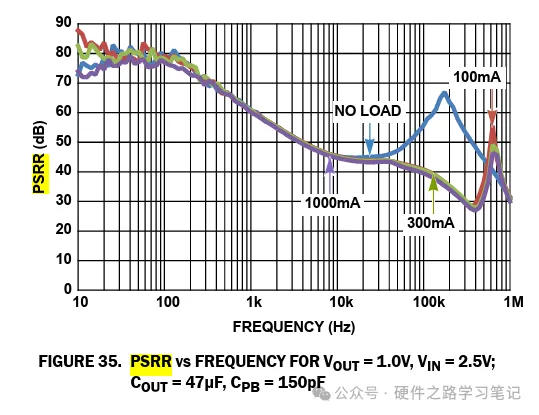 电源抑制比是一个很重要的参数,它代表了LDO抑制输入噪声的能力。定义是输入纹波电压与输出纹电压的比值,单位是分贝(dB),其表达式为: