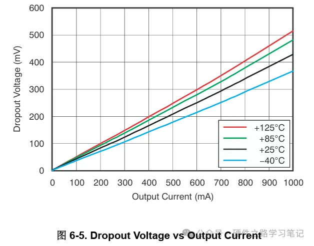 压降电压 Vdrop是指为实现正常稳压,输入电压 VIN必须高出所需输出电压 VOUT 的最小压差。压降与输出负载大小有关,如下图: