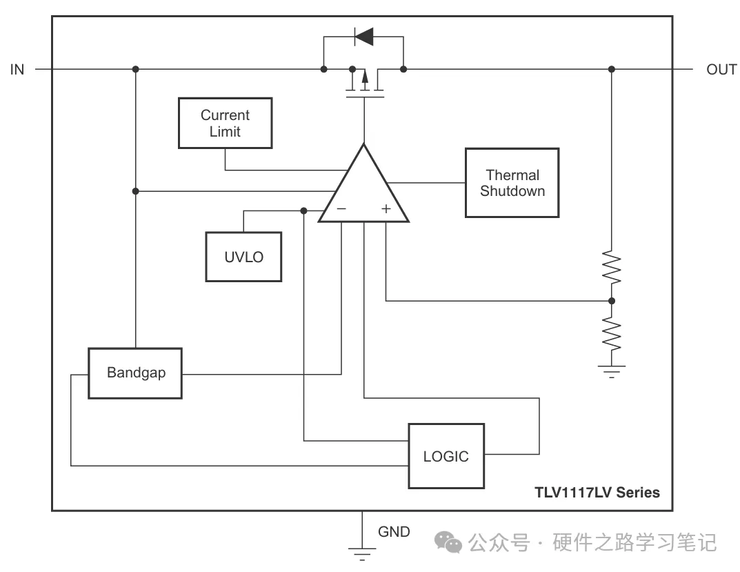 以TI的TLV1117LV33DCYR为例,他的内部架构如下图,明显是一种PMOS型LDO