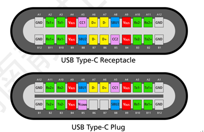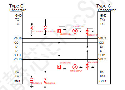 CC1、CC2:通信通道,用于识别连接设备和确定功率方向。SBU1、SBU2:辅助通道,可用于支持高速数据或其他功能。CC/SBU引脚紧挨着 VBUS 引脚。使用USB-PD的话,VBUS引脚电压可以达到20V,这样CC/SBU引脚容易短路到20V, 为了避免损坏,这两个引脚推荐24V ESD进行保护。