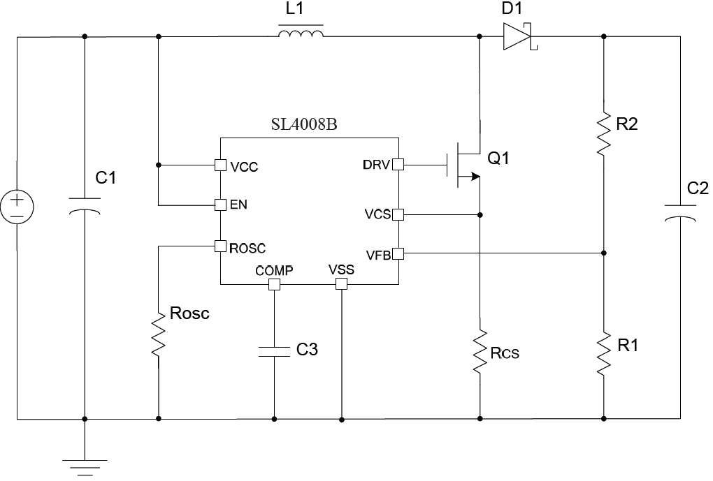 SL4008B通常与MOS管、电感、电容等元件组合使用,构成升压或升降压电路。具体电路设计需根据实际应用场景和参数需求进行调整。