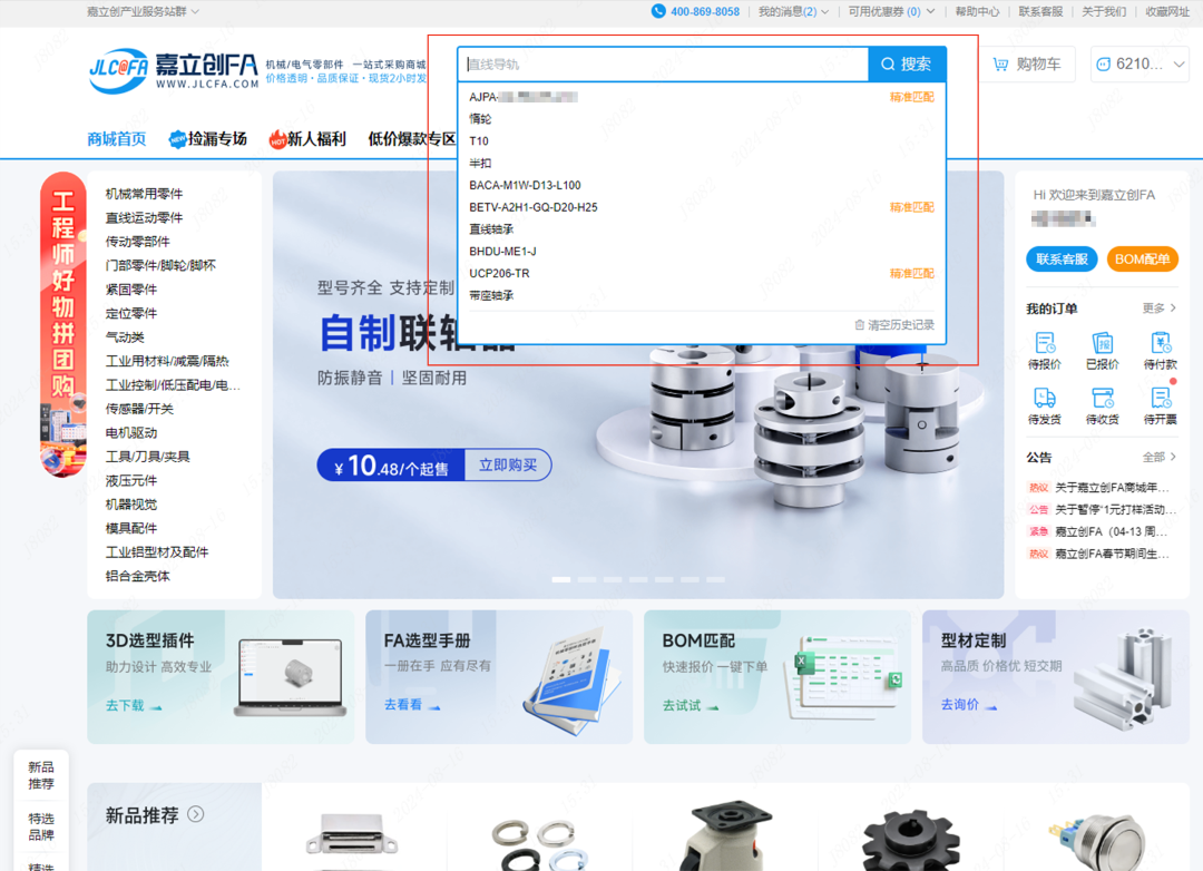 解决痛点:FA零部件行业产品型号非常杂乱,不同厂家间相同产品型号却不同,嘉立创FA通过同行型号关系映射,实现大部分友商型号的搜索匹配;支持不完整的型号搜索并提供高相关结果推荐;利用算法实现关键词联想,同时剔除无效的品牌、分类及下拉选项,优化界面样式,从而帮助用户快速精准地完成零部件查找与产品选型。