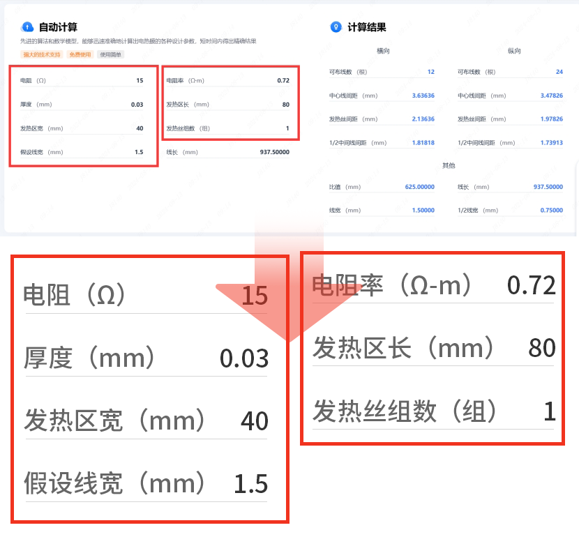 用户只需要输入电压、功率和电阻值,选择发热材料及布线外形区域尺寸,就可以立即速获取所需布线数量、总线长、线宽以及线间中心间距等关键数据,所有布线指导数据一目了然。