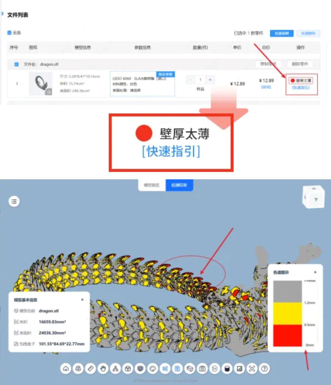 功能更新:3D打印下单平台上传模型文件,提供模型壁厚检测功能。用户也可在模型预览界面查看薄壁区域及壁厚情况,便于快速处理订单问题。