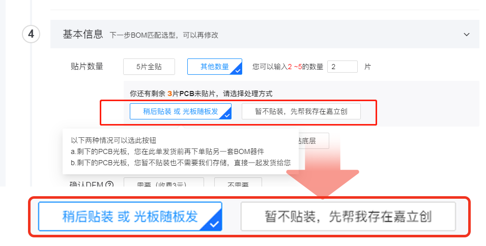 功能更新:用户下单标准型SMT时,可以仅贴部分,剩余PCB片数寄存在嘉立创。