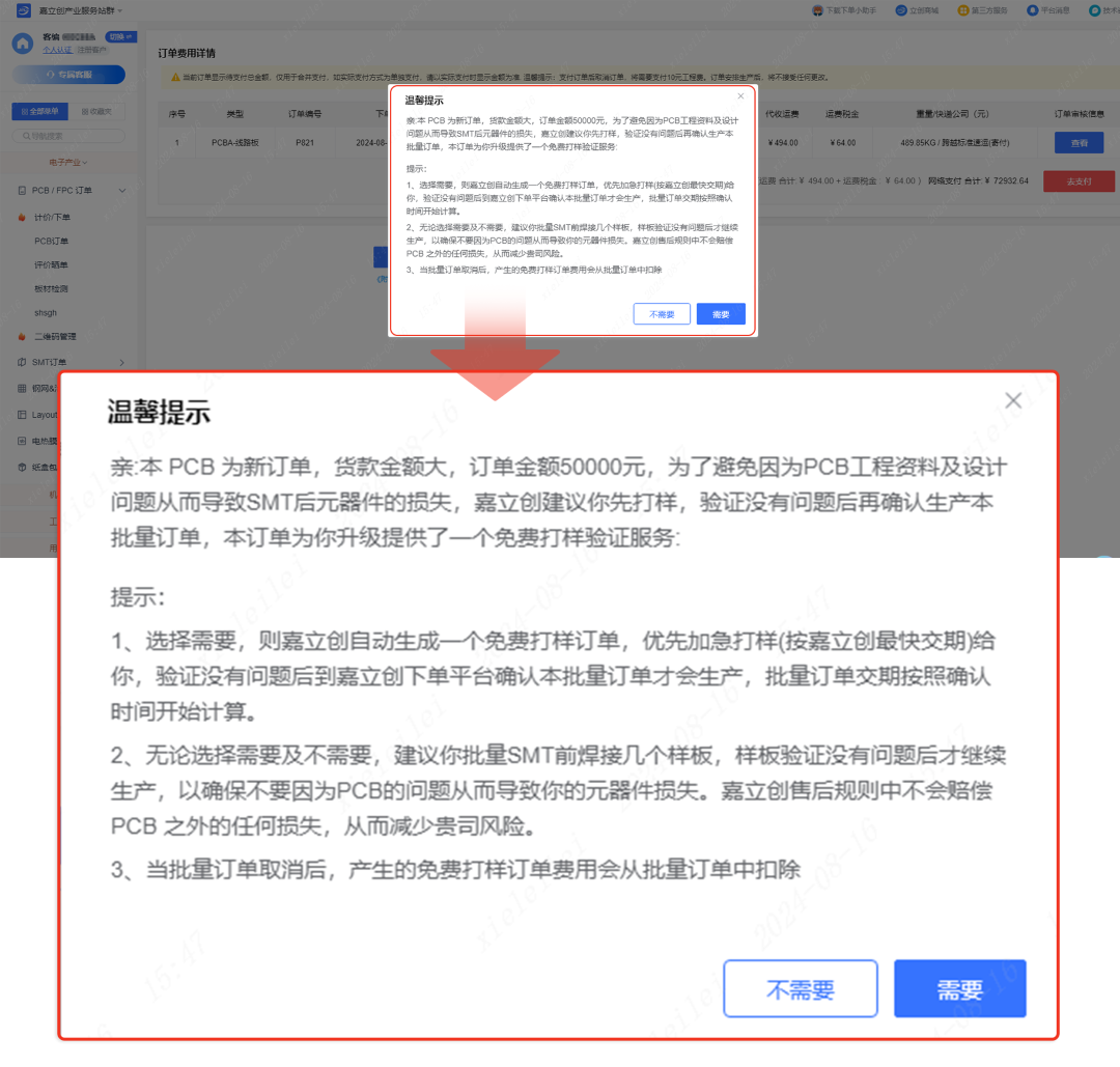功能更新:针对大批量订单,嘉立创提供免费打样试产服务。系统将在“订单审核通过后、支付前”以弹窗形式进行提醒。