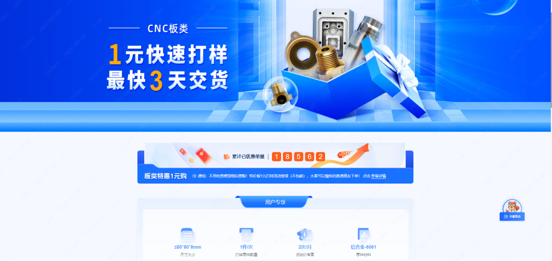 功能更新:CNC一元打样活动取消只支持新零件模型的限制。