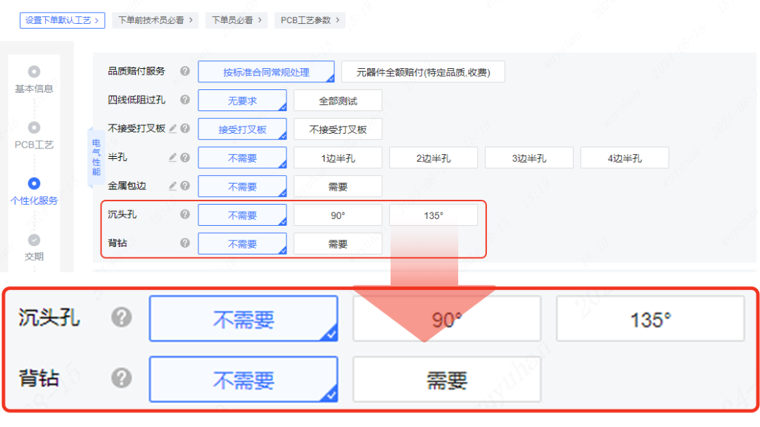 解决痛点:满足有此类工艺需求的用户。其中,背钻是一种特殊的钻孔工艺,主要用于解决多层板信号完整性问题。该工艺有利于减小杂讯干扰、提高信号完整性、减薄局部板厚以及减少盲埋孔的使用;沉头孔则是一种在PCB上制造特定形状孔的技术,主要用于安装特定类型的紧固件(如沉头螺丝)或其它需要与PCB表面齐平的紧固件。