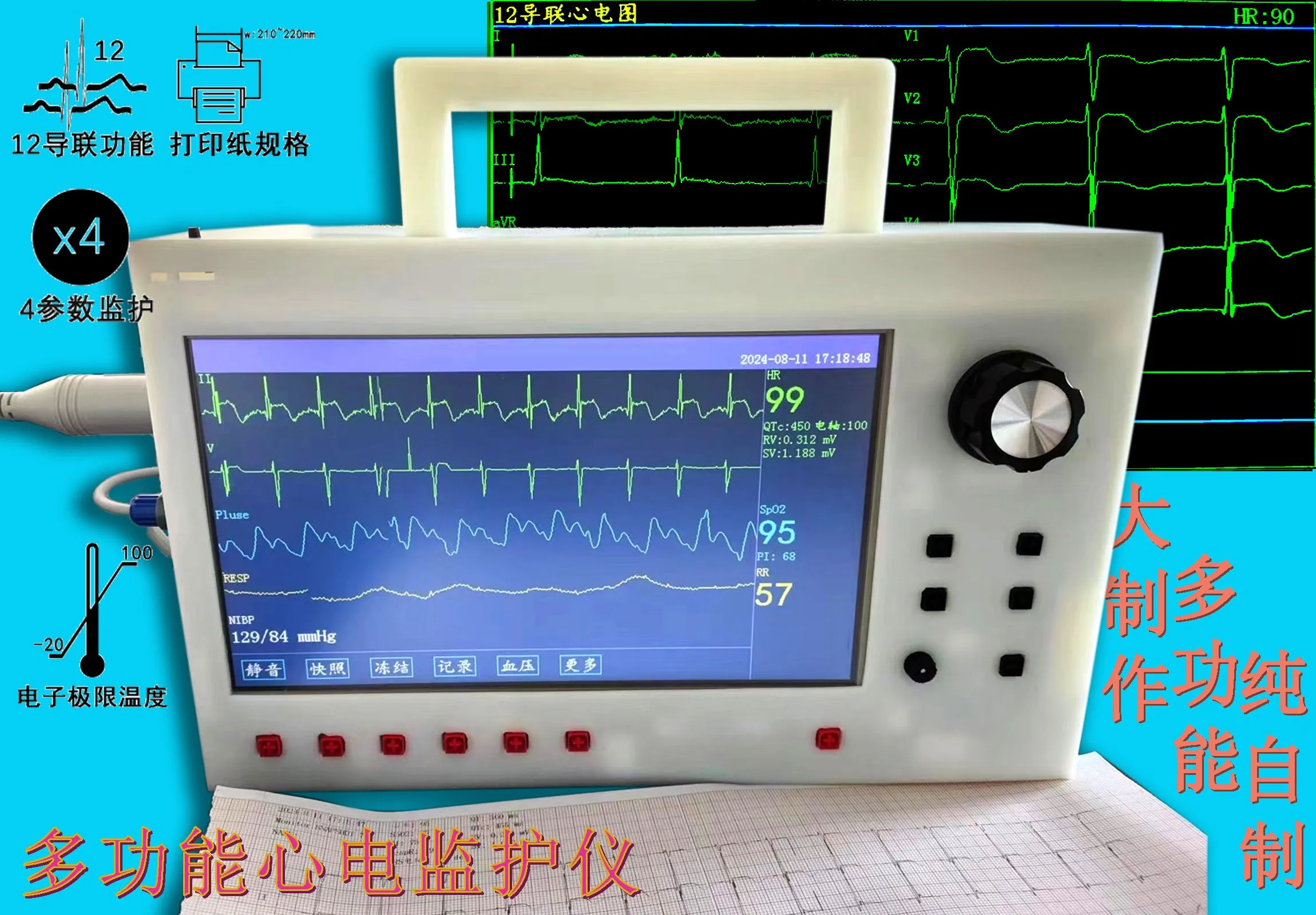 本项目将心电监护仪与十二导联心电图相结合, 功能强大,整机体积小,可使用一张A4纸近距离覆盖外壳任意一面!同时减轻了整机重量。若运用于急救系统,可减轻急救人员负重压力,可让急救员轻松穿过狭窄区域。
