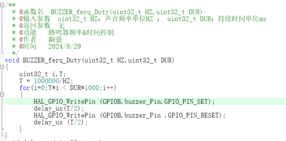 2.再在刚才编写的us延时函数下编写频率输出控制函数,由于周期为us级别,所以需要扩大1000 000倍计算,想要得到输出指定频率的脉冲,则控制GPIO高低电平反转各持续半个周期,对于持续时间的判断,则在输出频率前的for循环加入判断条件,DUR同样需要扩大1000倍,才可单位匹配。只需要对指定频率的周期个数计数,和DUR比较即可完成时间控制。