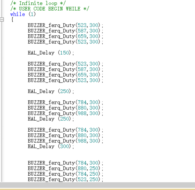 3.最后在main函数的while处编写调用此BUZZER_ferq_Duty函数,按照音谱表即可完成功能。