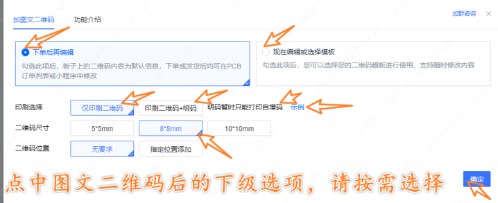 当光标点击 加图文二码后,出现如下选项,下单时要选上:【下单后再编辑】 或 【现在编辑或选择模版】: