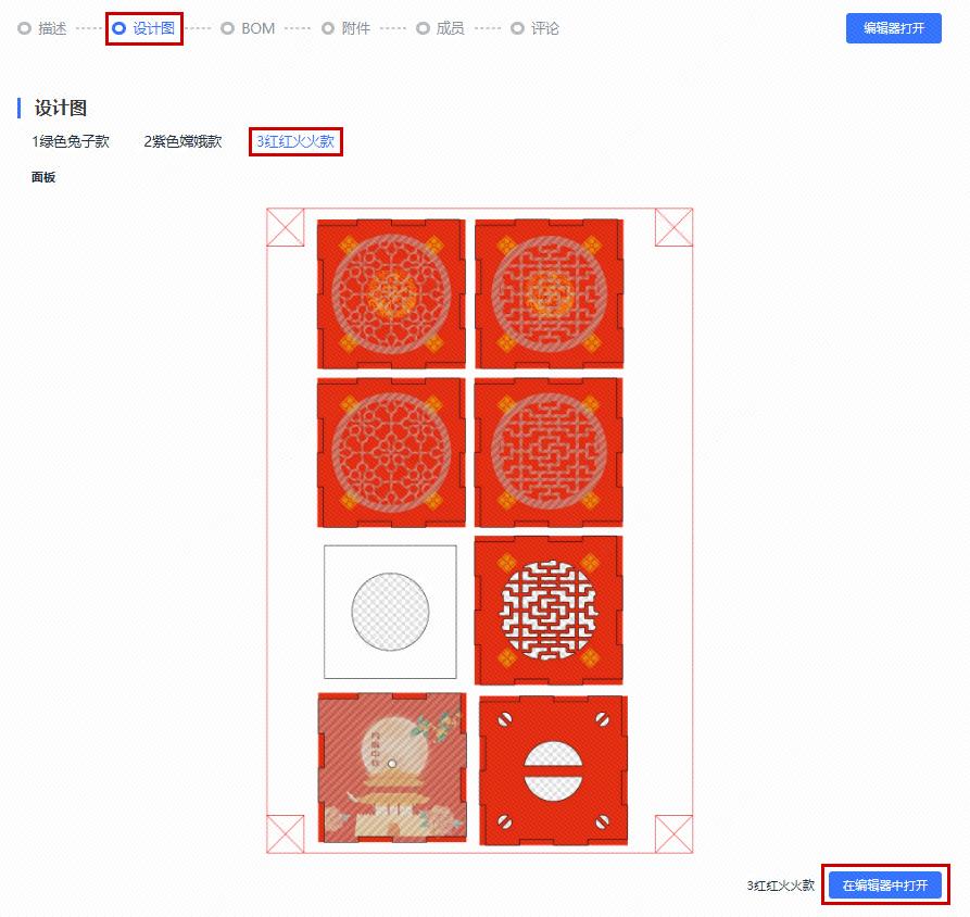 点击"设计图"—在三款里选择自己喜爱的风格—点击“在编辑器中打开”