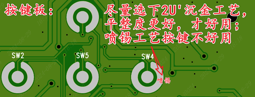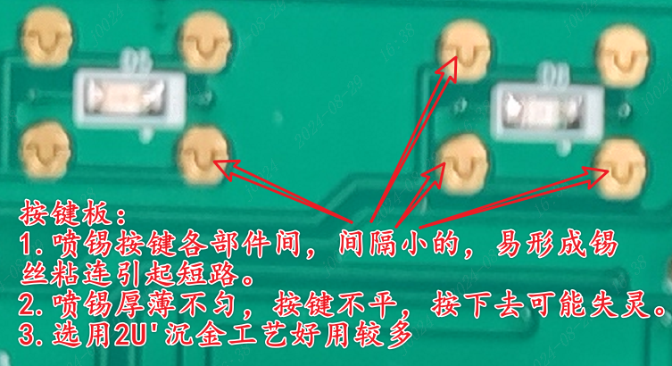 按键板注意事项:1.喷锡按键各部件间,间隔小的,易形成锡丝粘连引起短路。2.喷锡厚薄不匀,按键不平,按下去可能失灵。