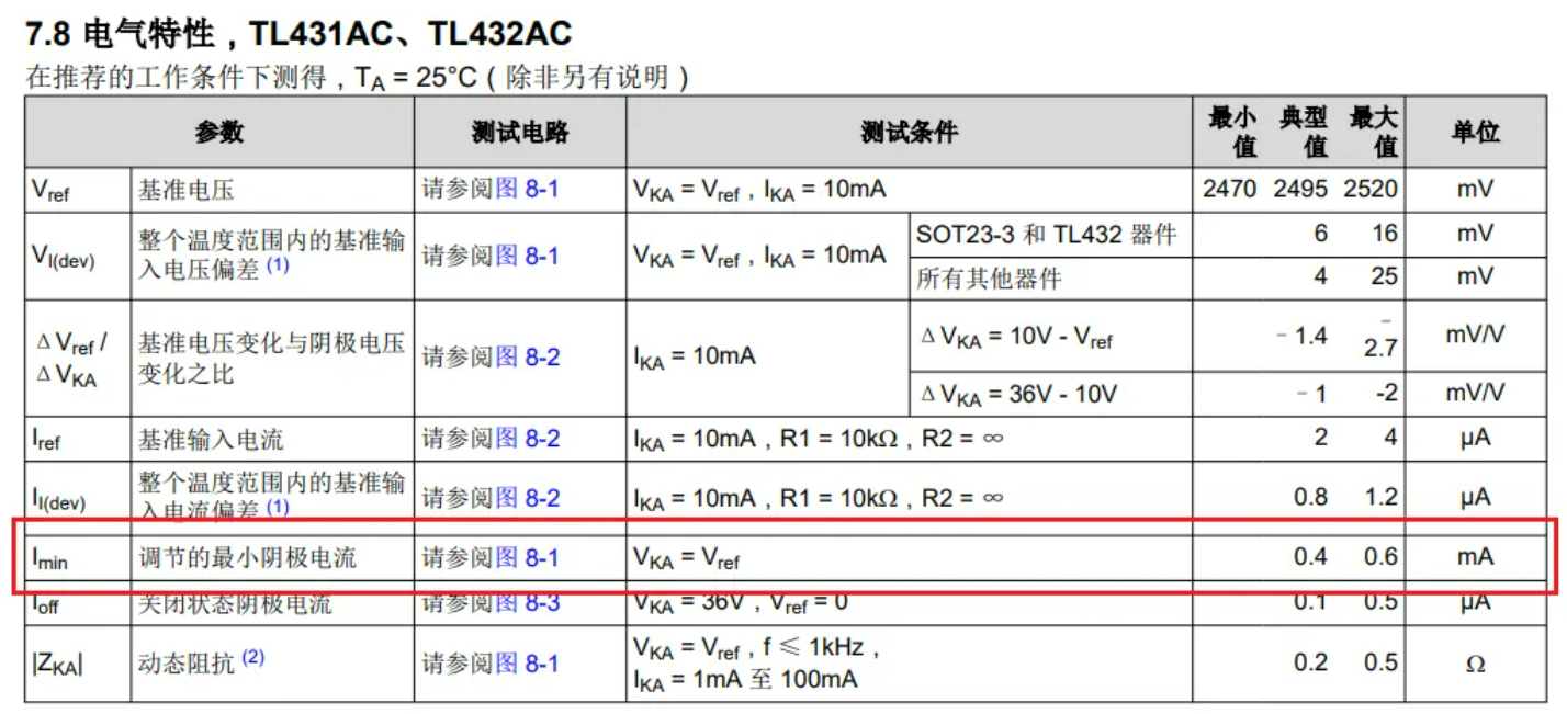 要注意的是,不同的431,或者基准源对最小工作电流的要求也不一样,选择基准源的时候一定要格外注意最小工作电流的需求。以防出现输出电压偏差。相同厂家的不同系列的电流要求也不一样,选择不同系列时也需要注意这个参数,例如TL431AC,最小工作电流Imin为0.6mA。