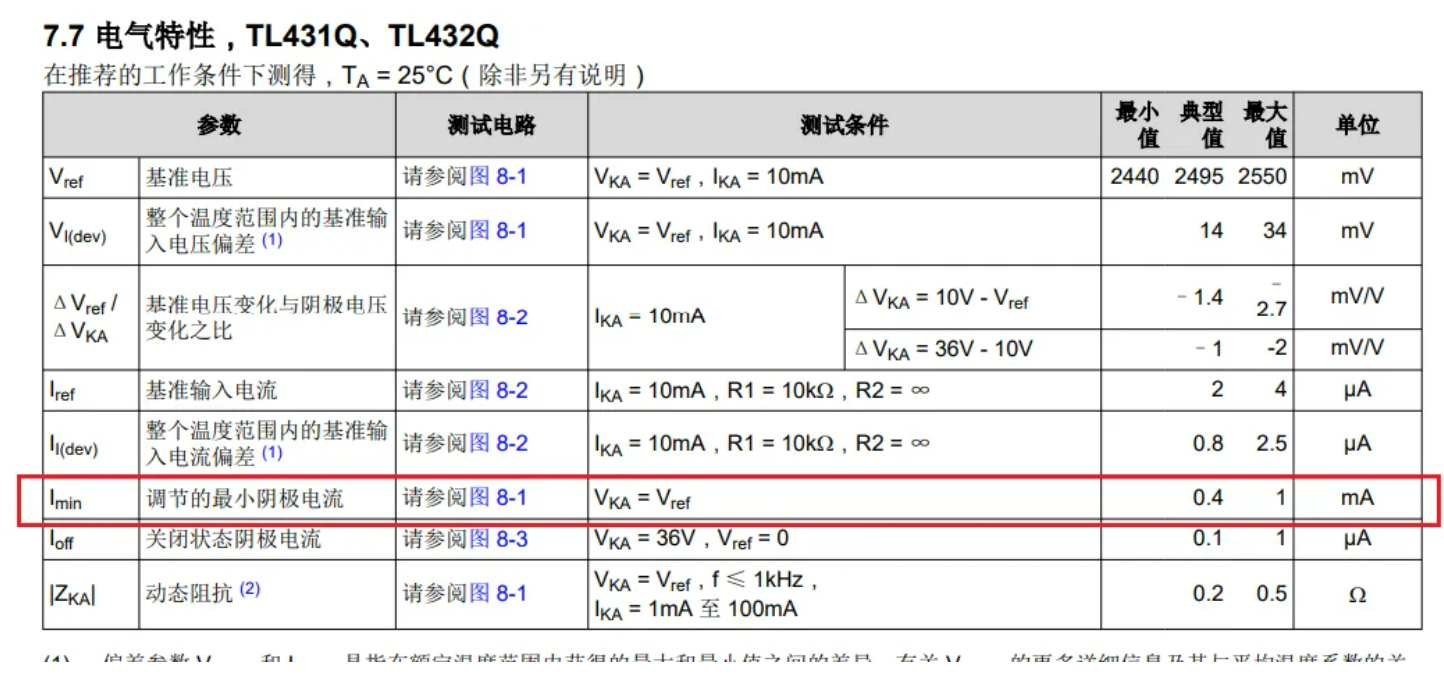 而TL431Q最小需要1mA,虽然这个差别不大,但是也是以此提醒各位道友,要注意这个参数,因为 不同厂家也会有所不同。所以选择的时候要仔细阅读一下规格书。