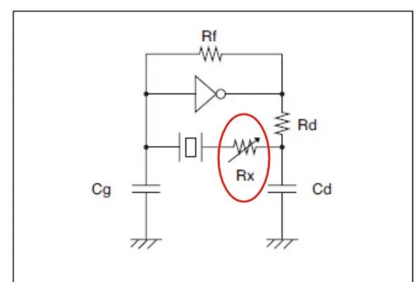 实测:与晶振串联连接上纯电阻 Rx,缓慢地使 Rx 值逐渐变大 , 测得停止振荡时 的电阻即为Rx。