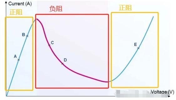 这里要注意,负阻不是一种器件,只是描述一种IV特性,和普通电阻相反的IV特性,是一种电路特性概念,人为定义的。实际上没有在所有工作范围内都是负阻特性的“负阻器件”,但有少数隧道二极管和有源电路在某些工况下具有负阻特性。负阻一般随电压电流工况是持续变化的。
