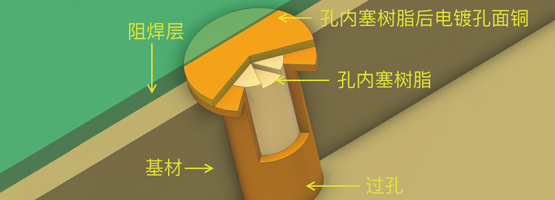 1、“盘中孔(树脂塞孔+电镀盖帽)”工艺,如下三维示意图: