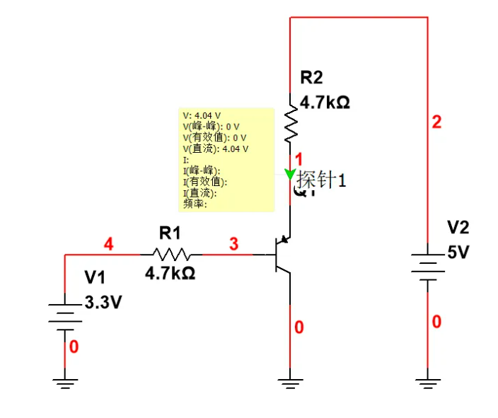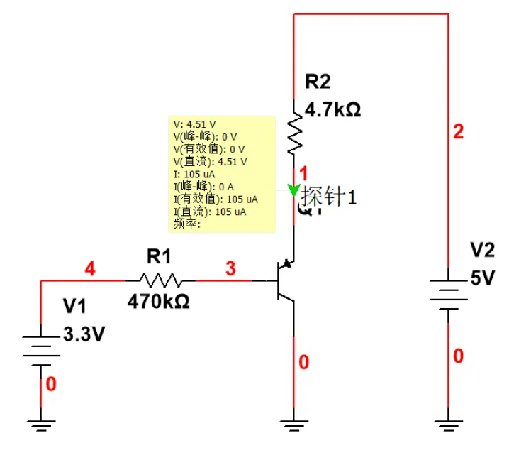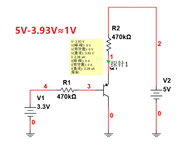 例如将R1加到470k,那么再根据公式推算,可知此时Ib电流降低至1uA,那么发射极电流也就基本为100uA左右,那么Vgs就降低为了0.47V,那么也就达不到PMOS的开启条件了。仿真也可以验证: