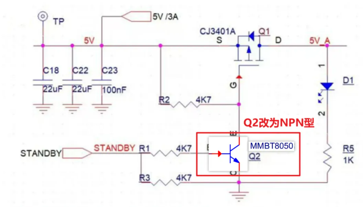 更换一颗导通电压更高的PMOS,例如最小导通电压(绝对值)为1.5V,那么就算三极管Q2处于放大区,那么Vgs也无法达到开启电压,也就可以实现PMOS的正常开关了。(这种方法不需要更改PCB)
