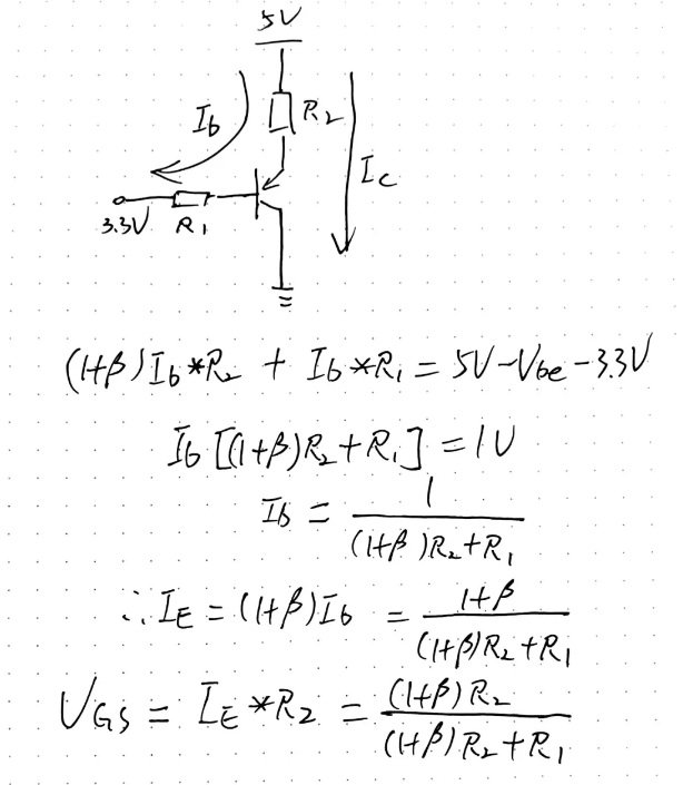 Ie*R2+Vbe+Ib*R1 = 5V - 3.3V