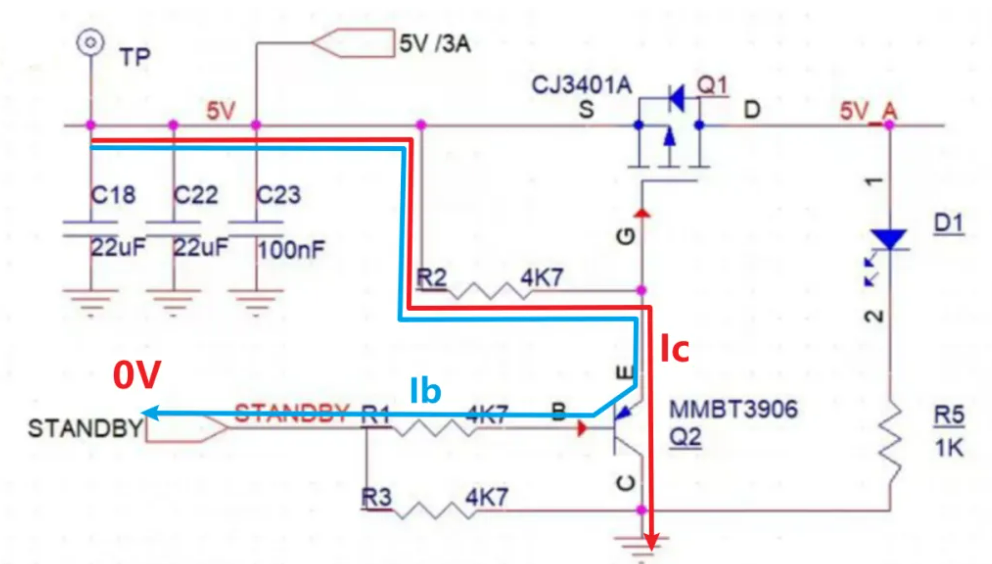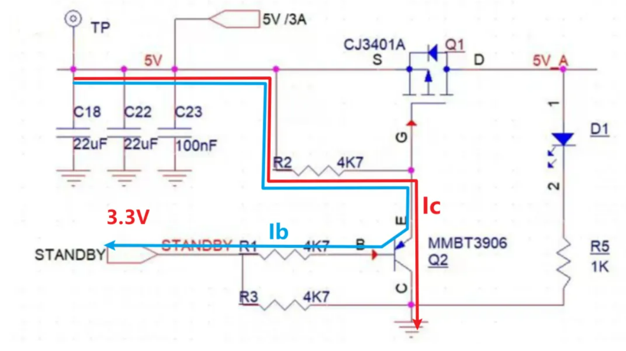 这个分析过程和问题一类似,当STANDY = 3.3V时,三极管Q2仍然处于放大状态,电流路径和问题一一样,下图红色为Ic集电极电流路径,蓝色是基极电流路径。