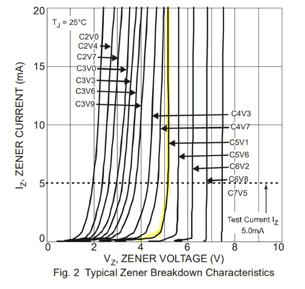 下图是BZT52C5V1的稳压特性曲线,已做黄色高亮标记,供各位朋友阅读参考: