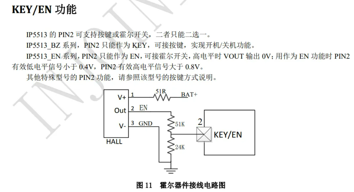 从IP5513的数据手册中找到了霍尔芯片与IP5513的连接示例图(实测也是如此), 这部分电路实现的功能是只有当耳机仓的上盖合上时才开始给蓝牙耳机充电(耳机仓上盖有磁铁) :