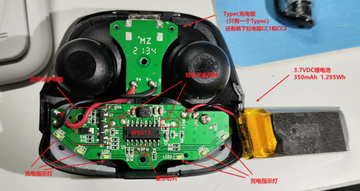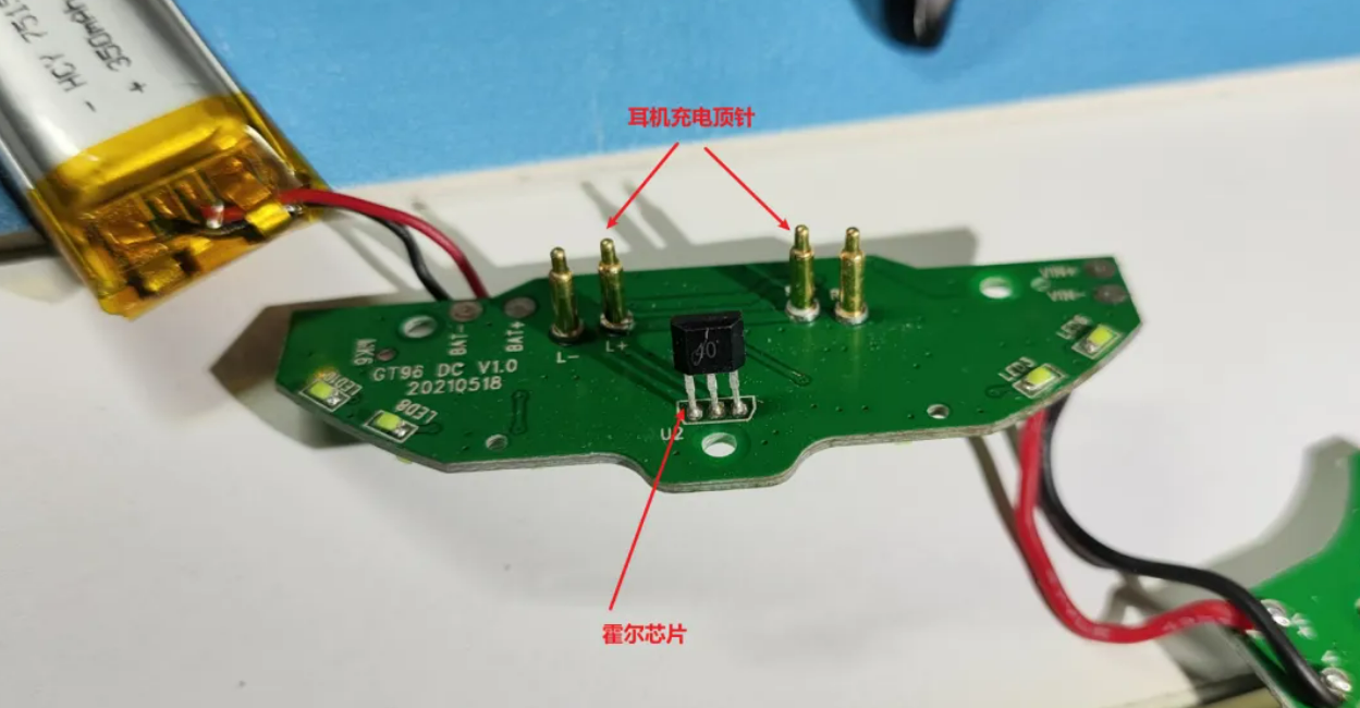 然后是耳机的充电仓,使用的是英集芯的IP5513充电芯片,一个霍尔芯片控制IP5513的使能脚。然后有一个MOS管和三极管组成的过压保护电路(实测过压保护点为5.7V左右),电路在后面。