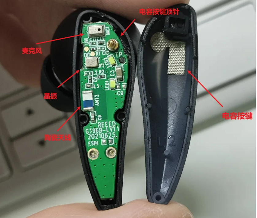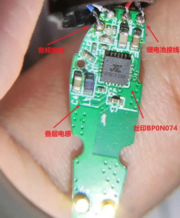 首先是耳机部分,主控是杰理的蓝牙芯片,丝印为BP0N074。麦克风一个,陶瓷天线一个,电容按键一个,拆解图如下: