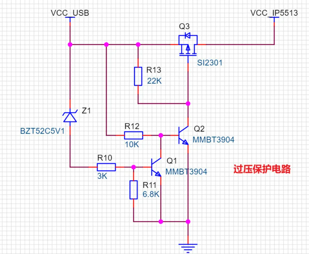 过压保护电路原理: 正常充电时,Z1截止,Q1截止,Q2导通,Q3导通,VCC_USB给VCC_IP5513供电 ; 当VCC_USB过压时(实测5.8V左右),Z1击穿,Q1导通,Q1导通后会使Q2基极拉低,导致Q2截止,从而导致Q3截止,然后VCC_USB停止给IP5513供电 。原理图如下: