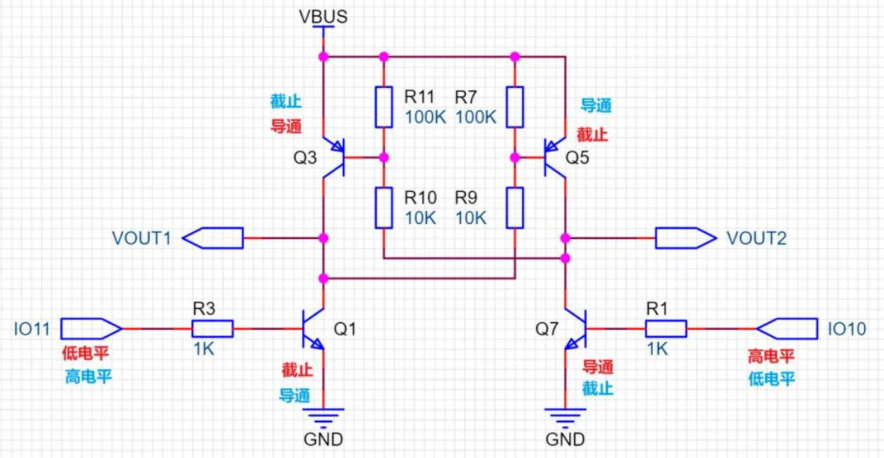 当IO10输出低电平,IO11输出高电平时,电流流向如下:VBUS流过Q5到VOUT2电极,然后流过人体再流到VOUT1电极,再流到Q1到GND。