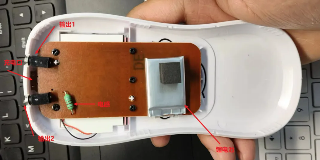 那么拆开前,不妨想一下,如果是你,你会怎么设计这个小玩意。拆开后背面一览无余,是一个单面板,在背面只有一个电池(有一个缓冲海绵),一颗色环电感,通过色环判断是一颗2.2mH的电感,然后就是两个输出端(连接电极片的)。