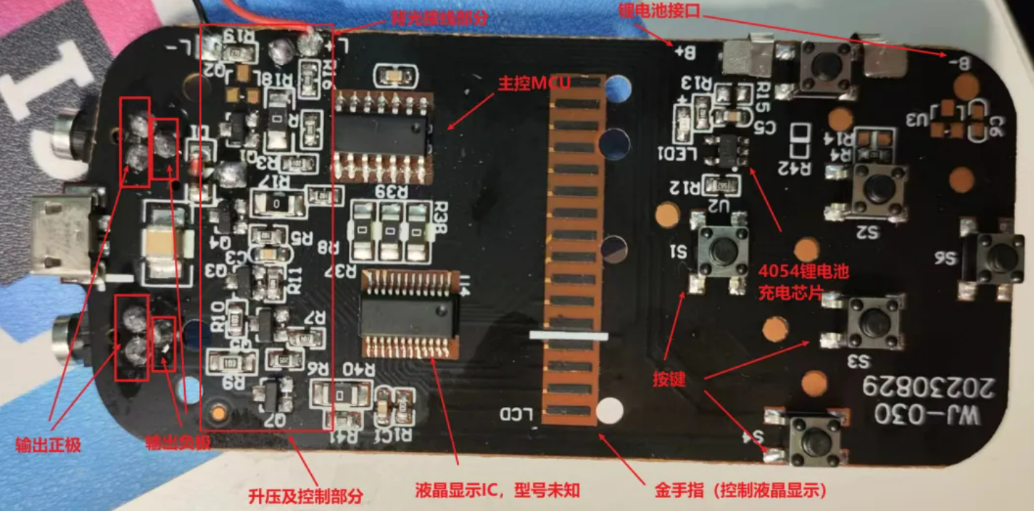 可以看到最左边是Micousb的充电接口。然后分了两个输出端(实际上就是一组正负),然后是 三极管组成的升压以及控制部分 (后面有原理图),然后是 一颗IC是液晶显示屏的驱动芯片 , 一颗IC是主IC用于控制升压及不同模式切换 ,同时这颗主IC会和液晶驱动IC通信,控制显示的信息。 锂电池充电 使用的是一颗 LTC4054 (丝印LTH7R)。整体的电路可以说还是蛮简单的。从电路板可以看出是2023年8月29号的PCB,也算是比较新的设计方案。