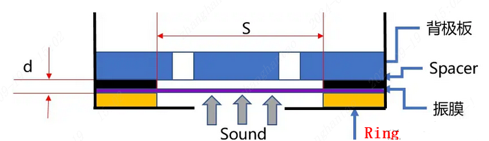 当振膜收到声压作用时产生振动,从而改变振膜与背极板之间的距离d,于是产生了Δd的变化,由公式(1)可知,其必然产生ΔC的变化,也就是