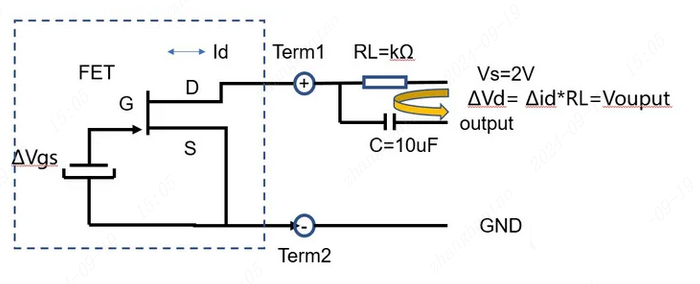 平行板电容器的两个极是接到FET的S极和G极,因此相当于FET的S极和G极之间加了一个ΔVgs的变化量,FET的漏极电流I就产生一个ΔId的变化量,因此这个电流的变化量就在电阻RL上产生一个ΔVd的变化量,这个电压的变化量就可以通过电容C输出,这个电压的变化量是由声压引起的,因此整个麦克风传感器就完成了一个声电的转换过程,将声音信号转化为电信号输出。