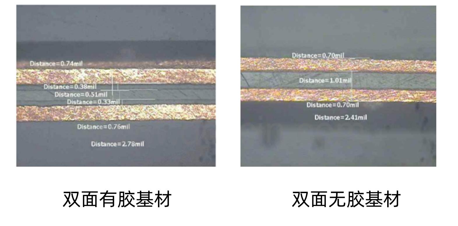 将FPC打切片放在显微镜下,观察PI与铜之间是否有AD胶,这种方法能够更精准地判断板子是否为有胶基材。