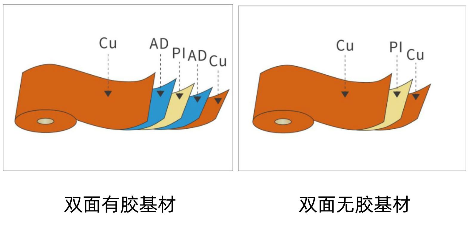 有胶基材:主要是以PI膜/接着剂(AD)/铜箔三层结构为主,通过涂压烘烤而成,接着剂一般为环氧树脂或丙烯酸胶。