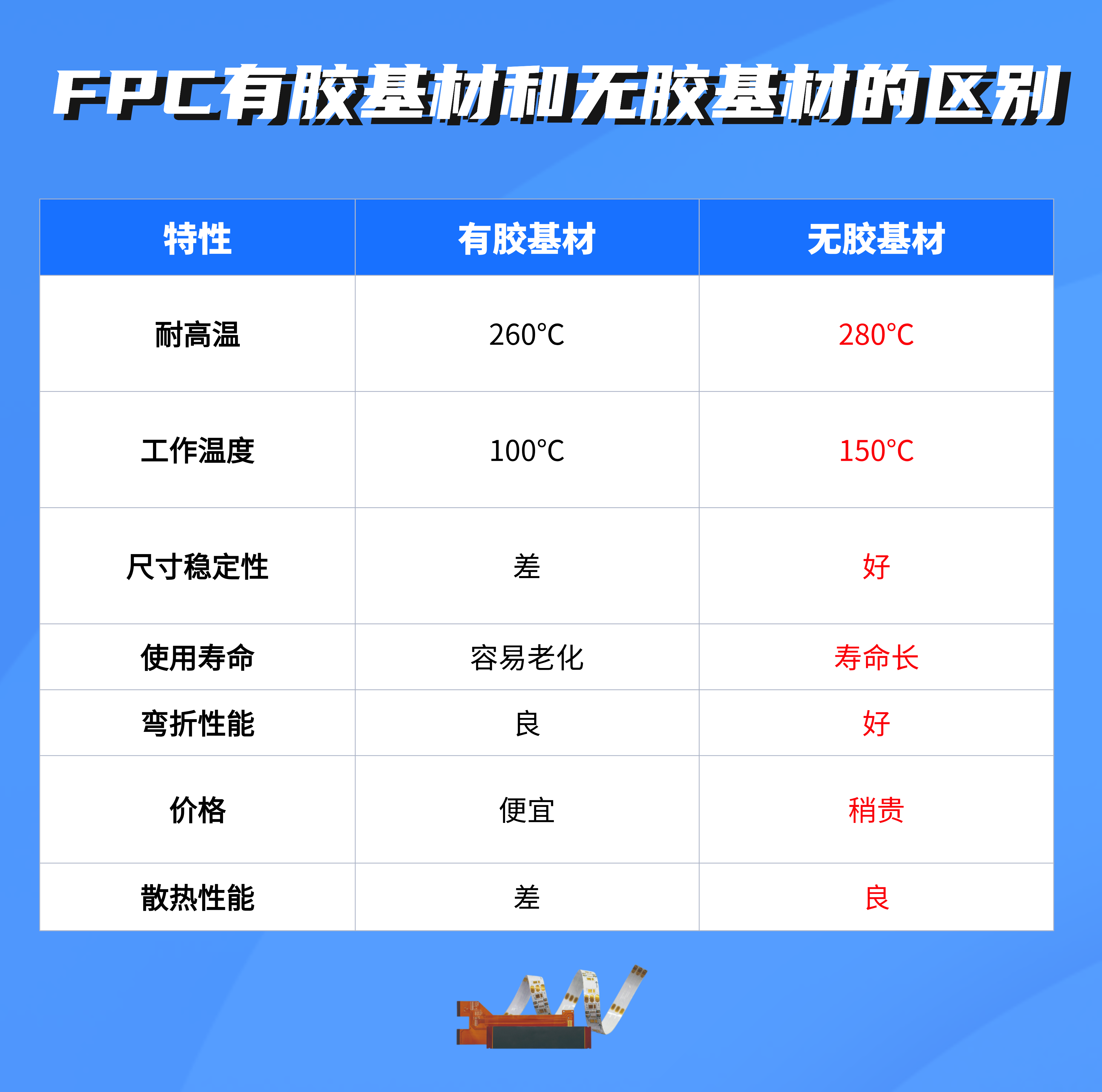 无胶基材因无需胶做为接着剂,性能比有胶基材要好,目前市场上90%的产品都要求使用无胶基材,具体如下: