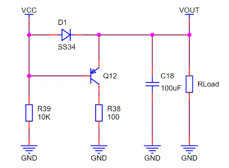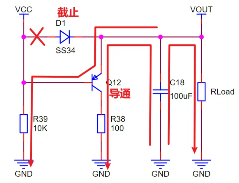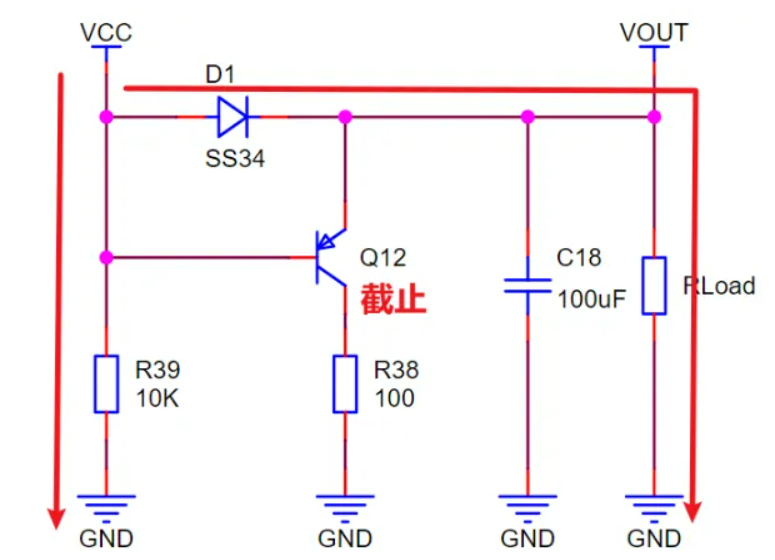 VCC供电时,二极管D1导通,三极管Q12截止,VCC通过二极管D1为负载供电,电流路径主要为下图红色所示,从电流路径也可以看出,这个电路的缺点就是在正常工作时电阻R39和二极管D1会额外的消耗能量: