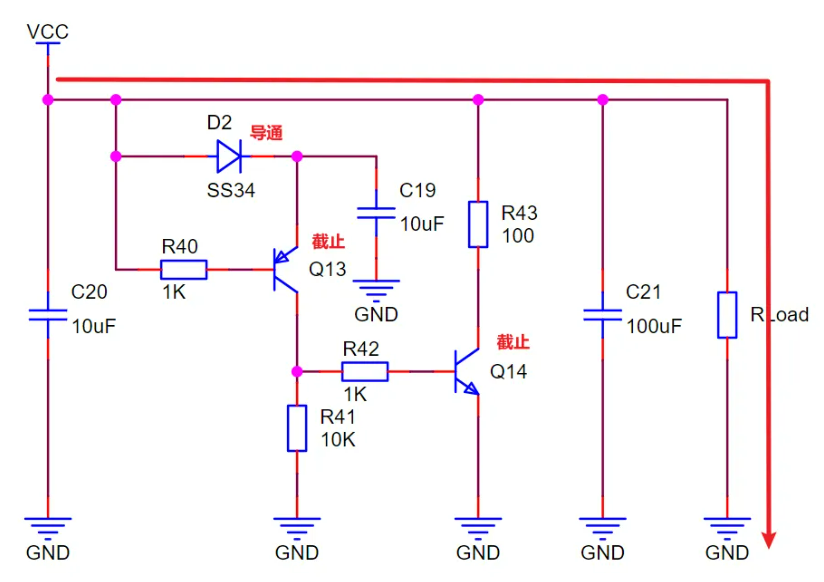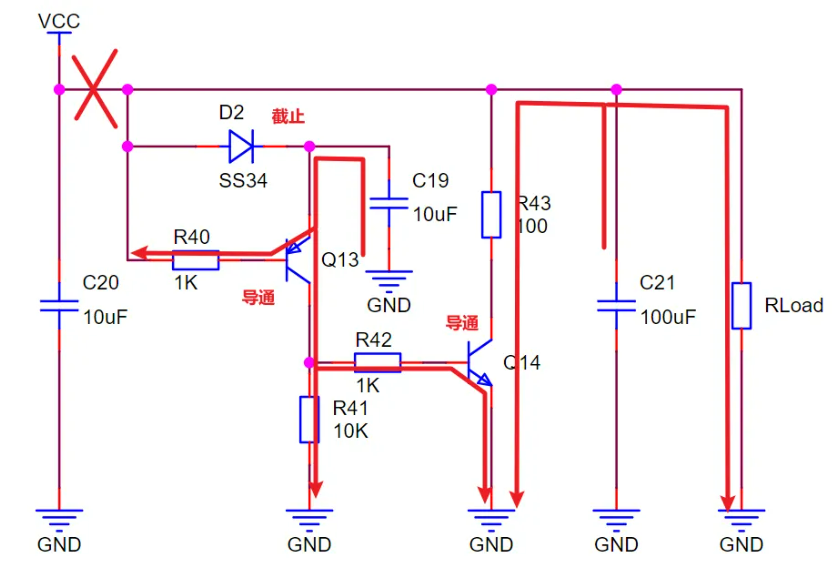当VCC断电时,二极管D2截止,由于电容C19上存储有电,所以当负载电容上的电压下降到大概为VCC-Vd-Vbe左右时,三极管Q13会导通,从而控制三极管Q14导通,负载电容C21上的电通过三极管Q14和电阻R43快速释放。电流路径如下所示: