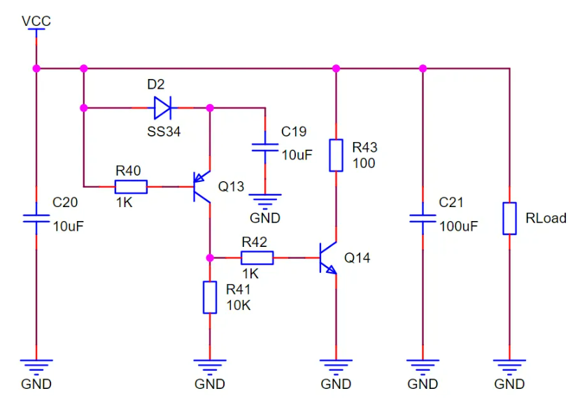 VCC供电时,二极管D2导通为C19储能,三极管Q13和三极管Q14截止,VCC直接为负载RLoad供电:
