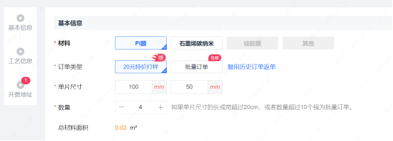 在电热膜下单页面,选择【PI膜】,选择【打样】还是【批量】,填写【单片尺寸】。