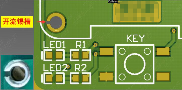 PCB焊盘上面开个过锡槽,以便过波峰焊时,这些焊锡会流掉。