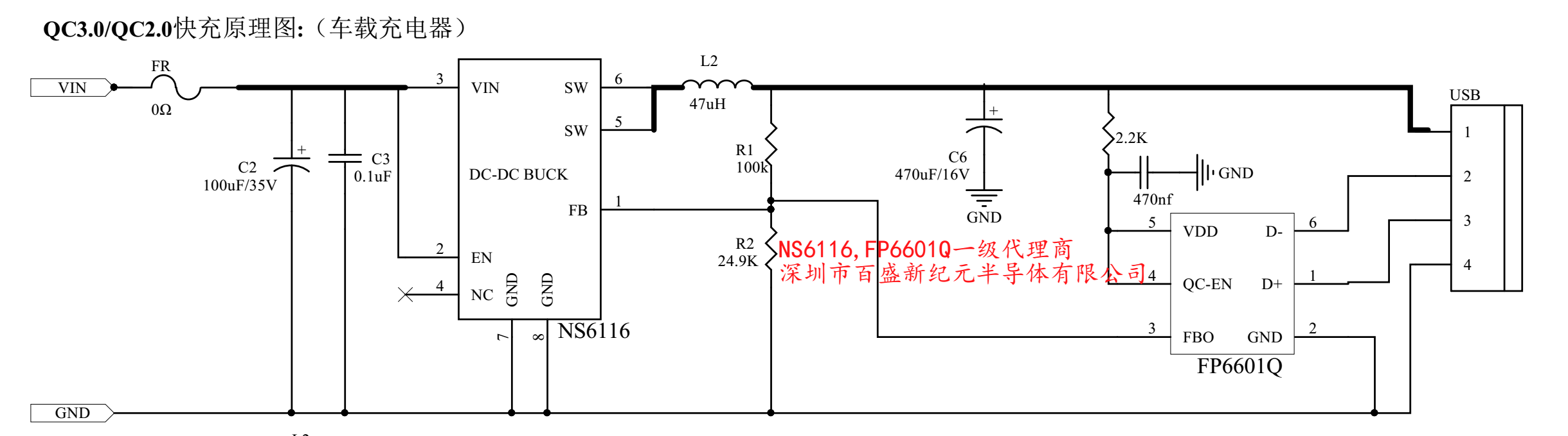 NS6116单口QC3.0快充车充充电器原理图,功能:支持QC3.0,QC2.0,华为FCP,三星AFC快充