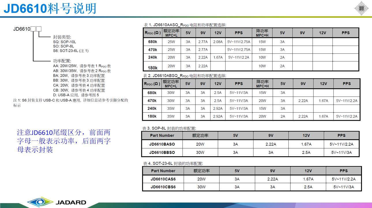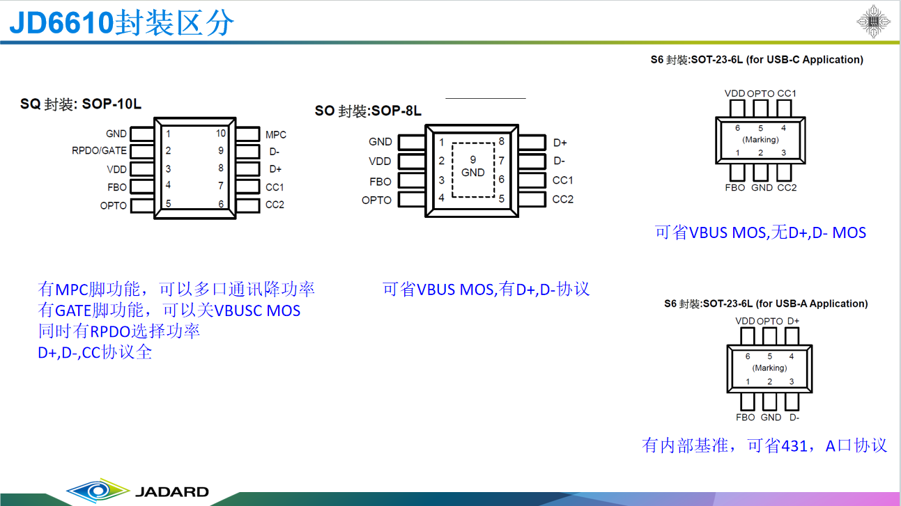 JD6610是一款简化的USB Power Delivery 3.1 SPR及可编程电源 (PPS) 协议控制器。 它也支持 华为的快速充电协议(FCP),超级充电协议(SCP)、 AFC充电协议和高通的QC 2.0 / 3.0 / 3+充电协议技 术,这些技术专为USB Type-C充电应用而设计,如 电源适配器,壁式充电器,配电盘等。 JD6610监控CC引脚以检测USB-C型端口插入/拔 除。且提供5V至12V的输出电压及9V Prog电压范 围。检测VBUS电压,以实现兼容的连接端口。此外, JD6610还监控USB D+ / D-数据线,并根据不同的 设备要求自动调节输出电压。 其提供3.6V至12V的 输出电压范围。 JD6610支持CV模式,用于电压环路调节的参考电 压,以在高精度控制应用中提供恒定电压的调节。