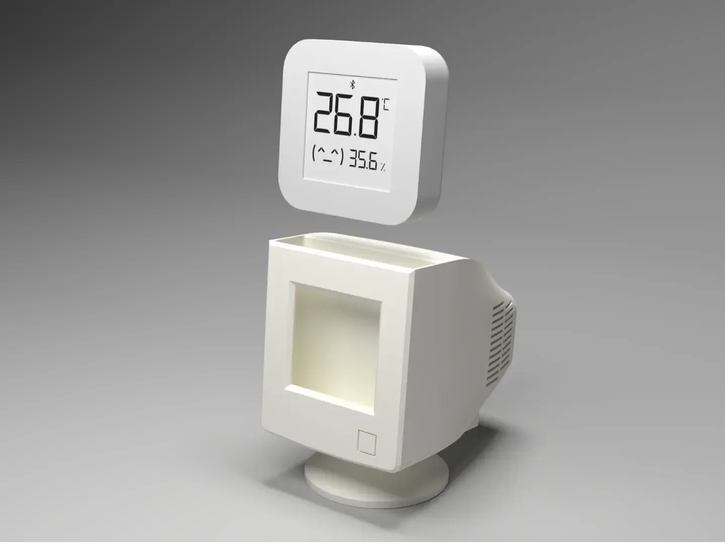 家里有个温湿度计支架丢了,立马设计一个支架,3D打印验证。将米家温度计放置其中,效果确实不错。